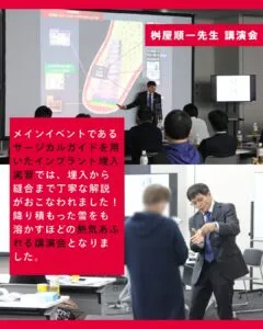 午前は、骨補填材の種類や使用方法について講義を行い、臨床に活かせる知識を中心に解説しました。午後は、サージカルガイドを用いたインプラント埋入実習を実施し、埋入から縫合まで丁寧に説明いたしました。